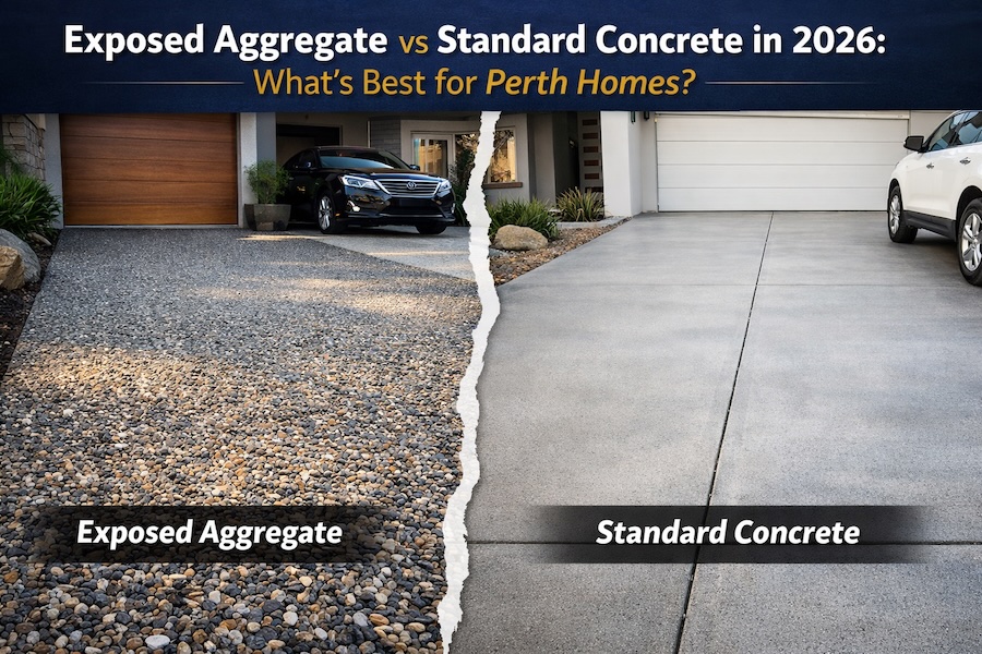 Exposed aggregate driveways vs standard concrete is a choice between finish, grip, and street appeal versus simplicity and upfront cost. Exposed aggregate gives you a textured, decorative surface that suits many Perth homes, especially where the driveway is visible from the street or has a slight slope. Standard concrete is the clean, practical option that keeps the budget down and still delivers a strong, long-lasting driveway when it’s installed properly.